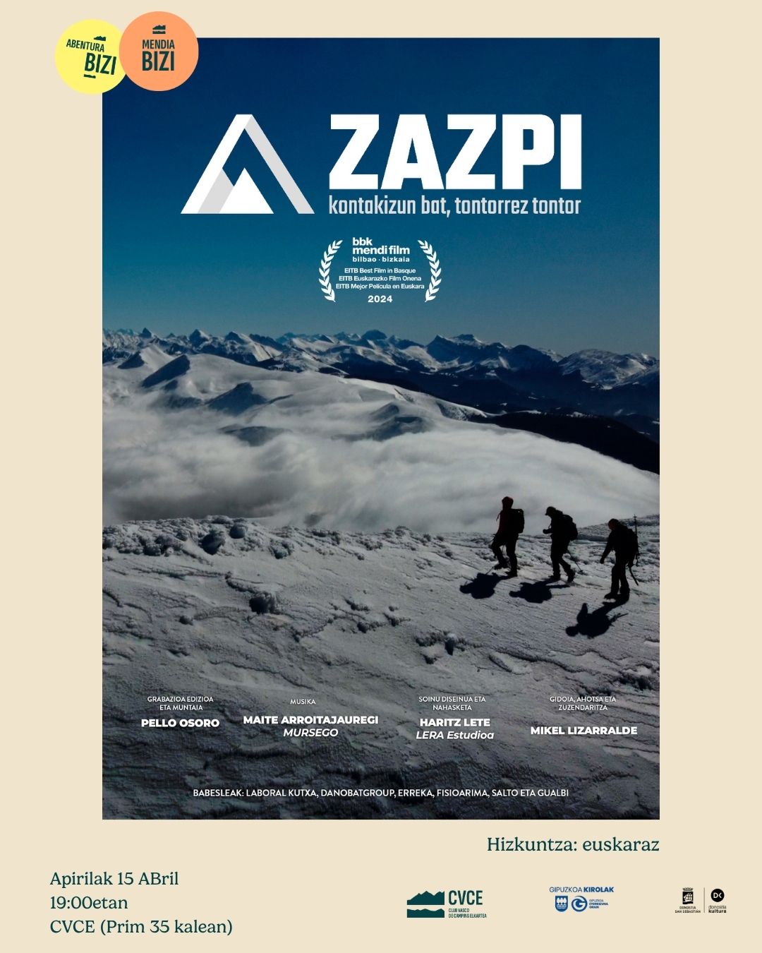 Apirilaren 15ean, CVCE-n, ZAZPI dokumentalaren proiekzioa izango da. Mikel Lizarraldek Euskal Herriko lurralde bakoitzeko tontor garaienak lotzen dituen bidaia kontatzen du, 300 kilometro baino gehiagoko ibilbidean. Bidean, esklerosi anizkoitzaren diagnostikoari aurre eginez, bizitza normal baten aldeko bere borroka eta jarrera baikorra partekatzen ditu.